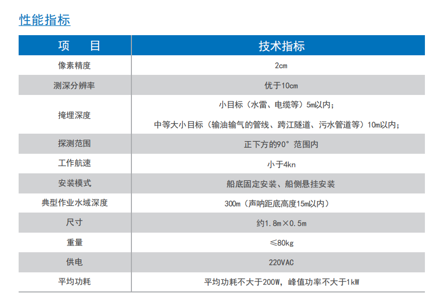 低频三维合成孔径声呐(YQ-LF3DSAS C) 对浅海海底掩埋目标进行高清晰三维成像。典型的工作水域深度 300m、声呐距离海 底 15m 以内,探测目标掩埋深度 10m 以内(光缆、电缆、油气管道、LNG 管道等)。